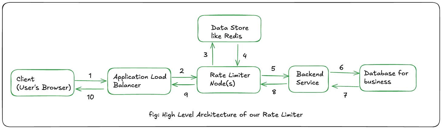 Load Balancer: The request first encounters a Load Balancer. This component is responsible for distributing incoming traffic across multiple instances of the rate limiter service, ensuring even distribution and contributing to overall system availability.